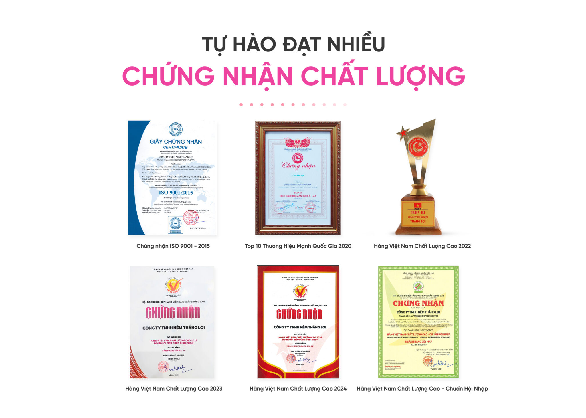 Với phương châm “Chất lượng tạo nên uy tín – Uy tín tạo nên thương hiệu”, Nệm Thắng Lợi không ngừng nỗ lực để xứng đáng với niềm tin mà khách hàng đã và đang gửi gắm.