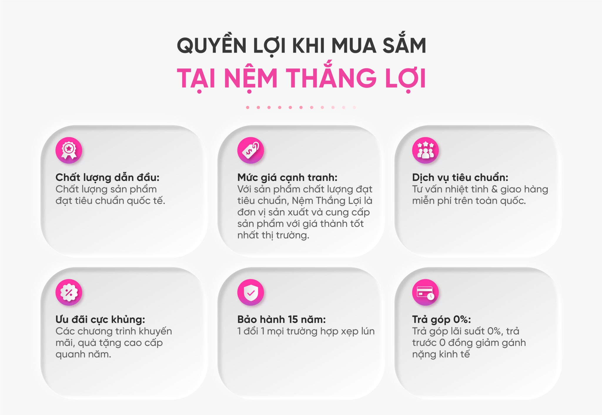 Nệm Thắng Lợi cam kết mang đến cho khách hàng những sản phẩm đúng chất lượng – đúng giá trị – đúng cam kết. Mỗi chiếc nệm không chỉ là một sản phẩm, mà còn là sự chăm sóc cho sức khỏe và giấc ngủ của cả gia đình.