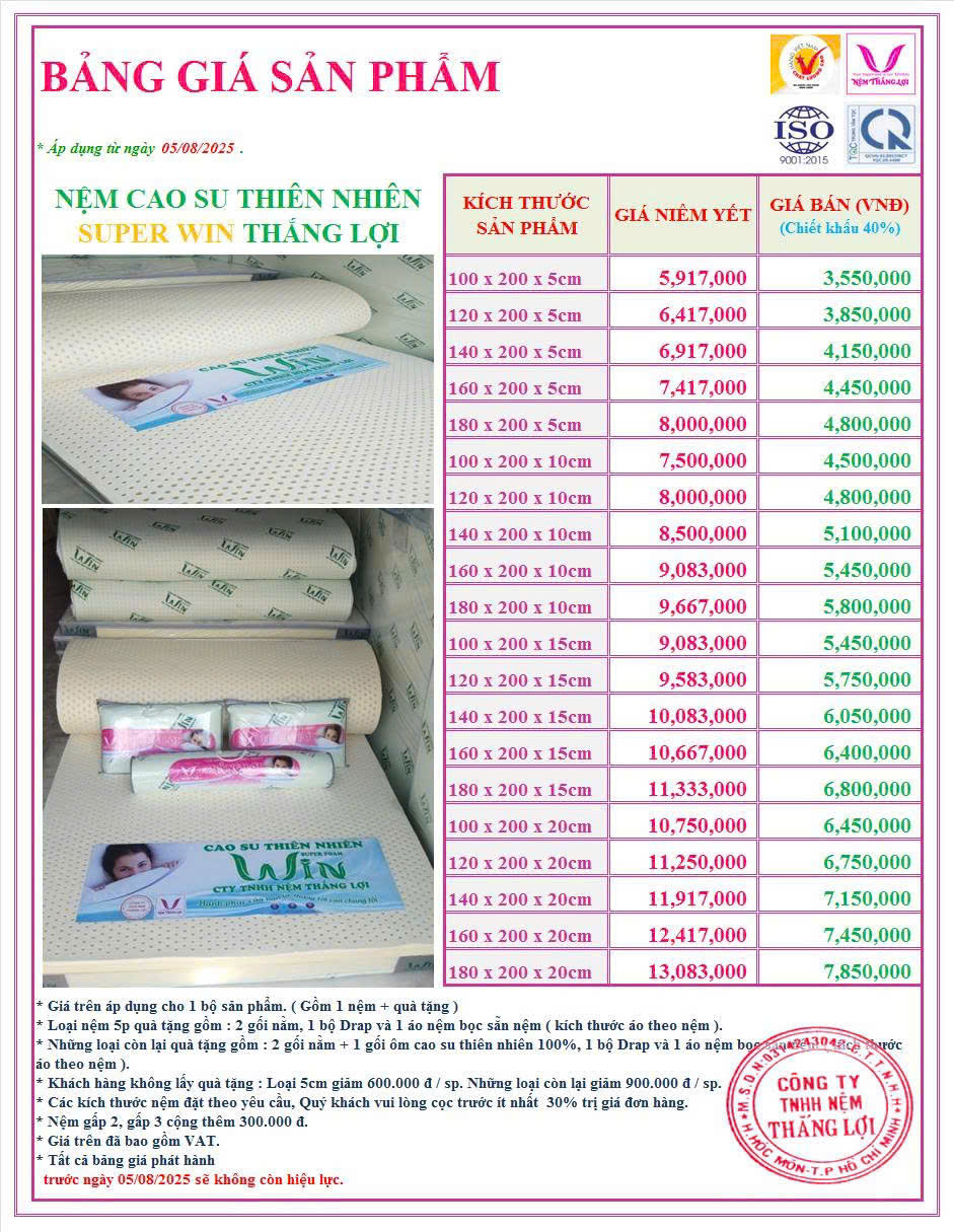 Bảng giá Nệm cao su thiên nhiên Super Win Thắng Lợi
