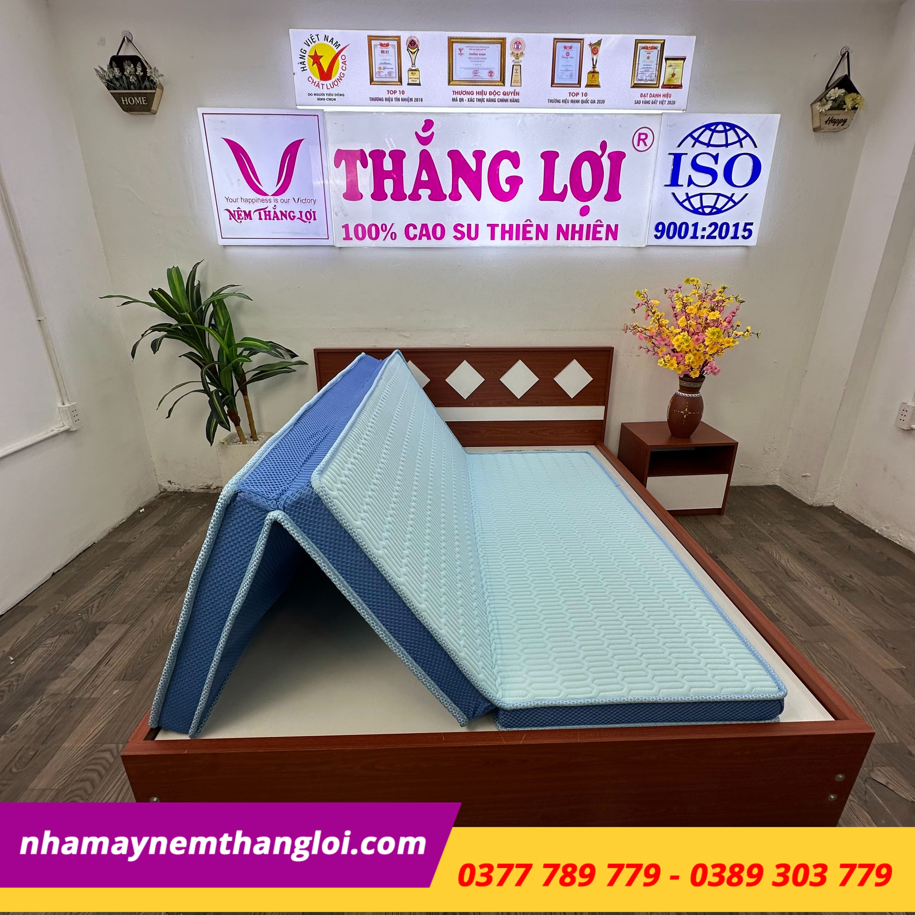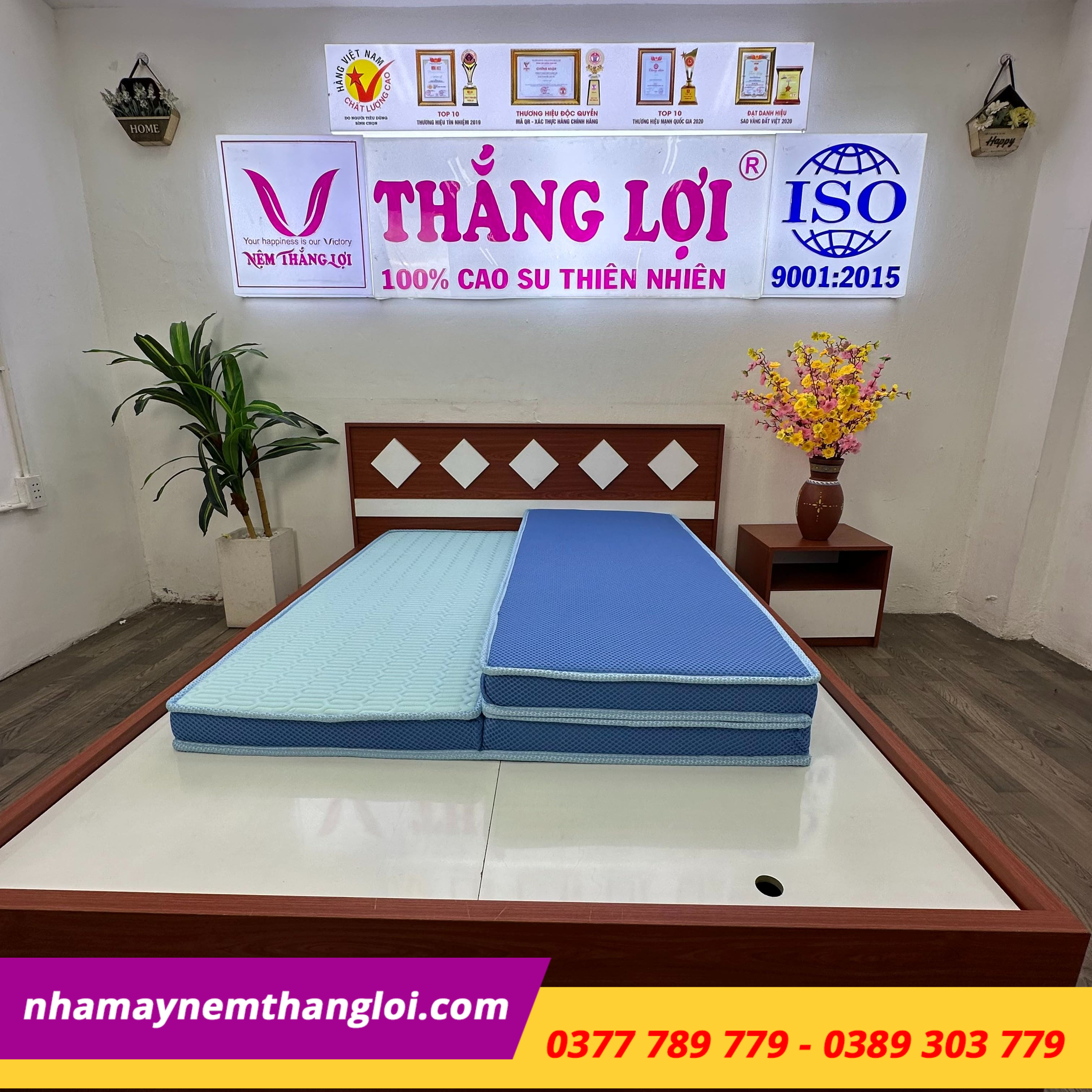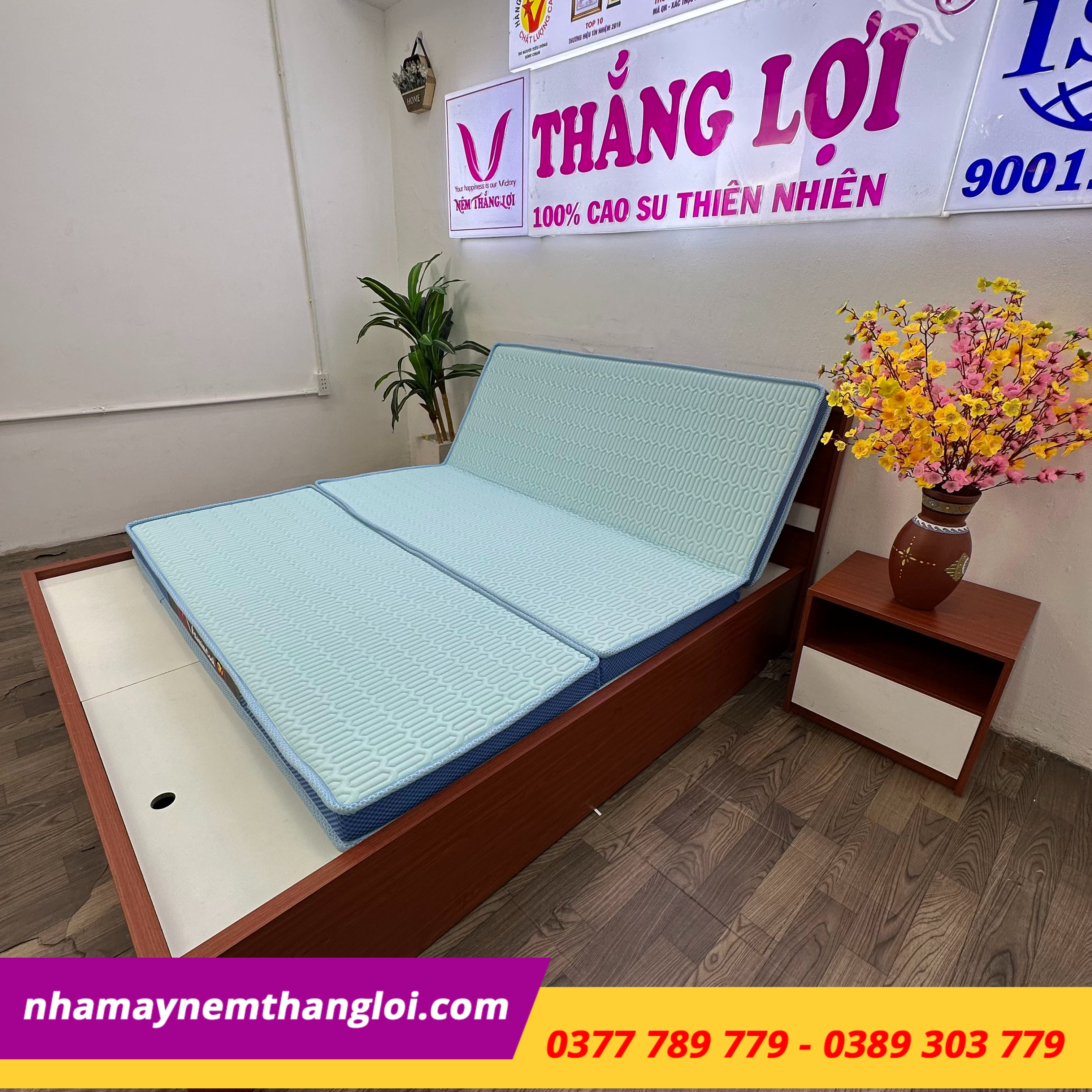 Kiểm tra tem mác sản phẩm: Nệm chính hãng có tem bảo hành, logo Thắng Lợi rõ ràng.