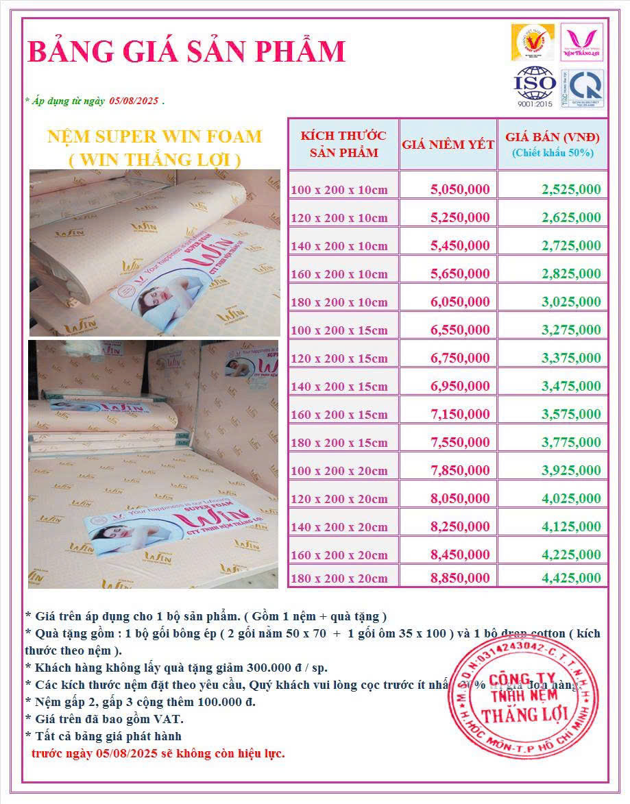 Bảng giá Nệm Super Win Foam (Win Thắng Lợi)